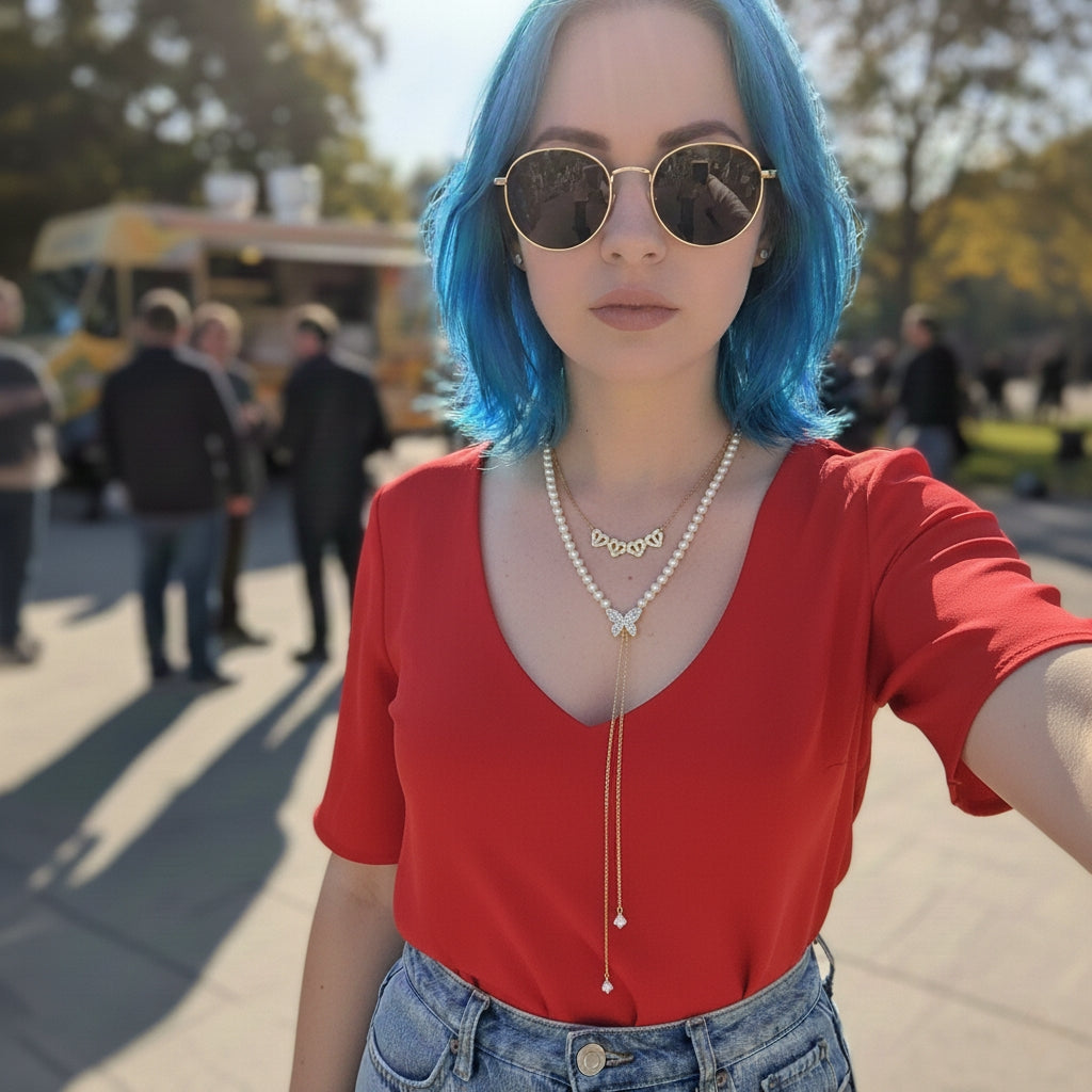 "Mi parte favorita es que son dos collares totalmente diferentes, pero se ven espectaculares juntos. A veces uso solo el de Trébol (cerrado en forma de corazón) para la oficina, y el de Mariposa con las perlas me lo pongo más largo para salir. ¡Es como tener 3 collares nuevos por el precio de uno! Si lo dudan, cómprenlo. El material es súper resistente y no se ha opacado nada."